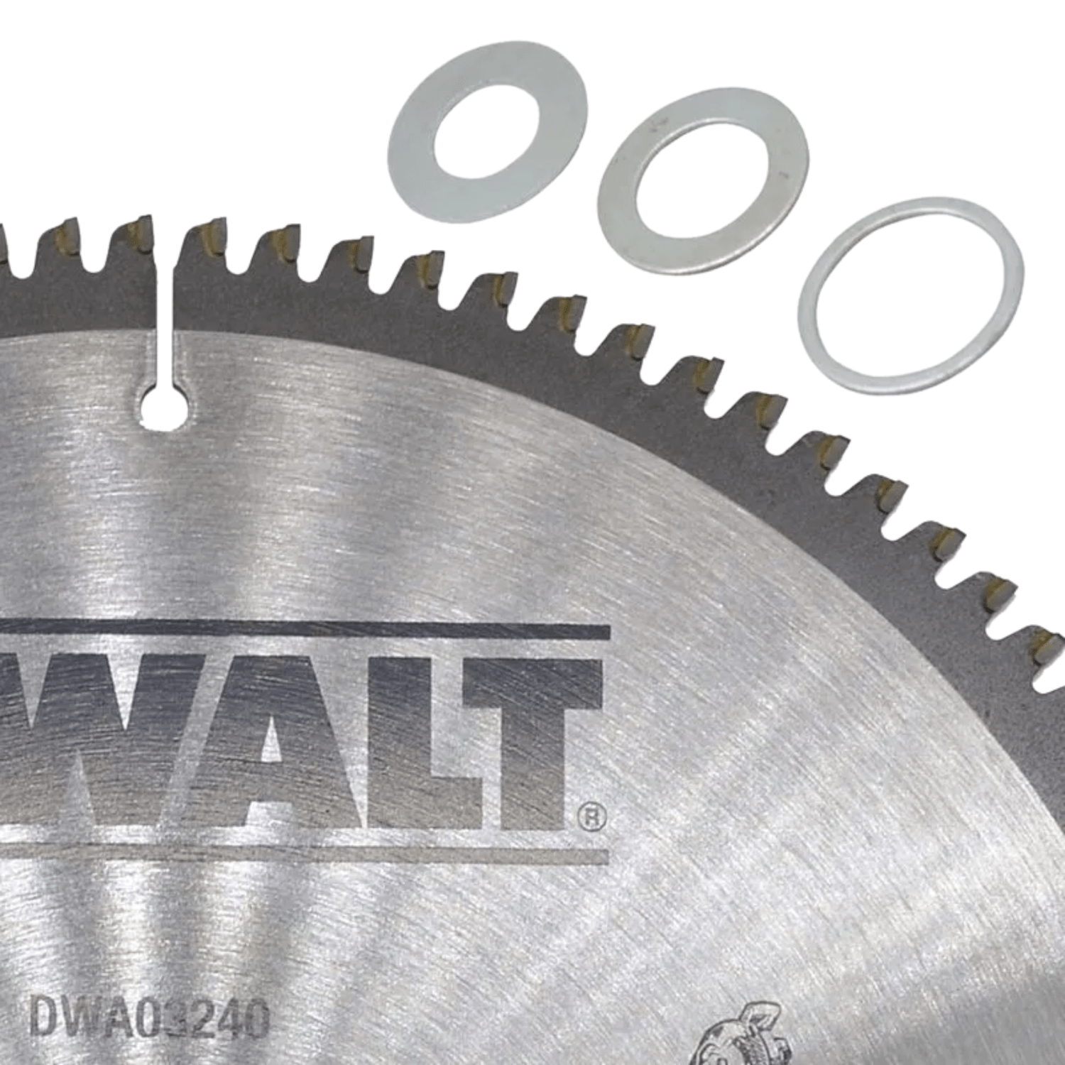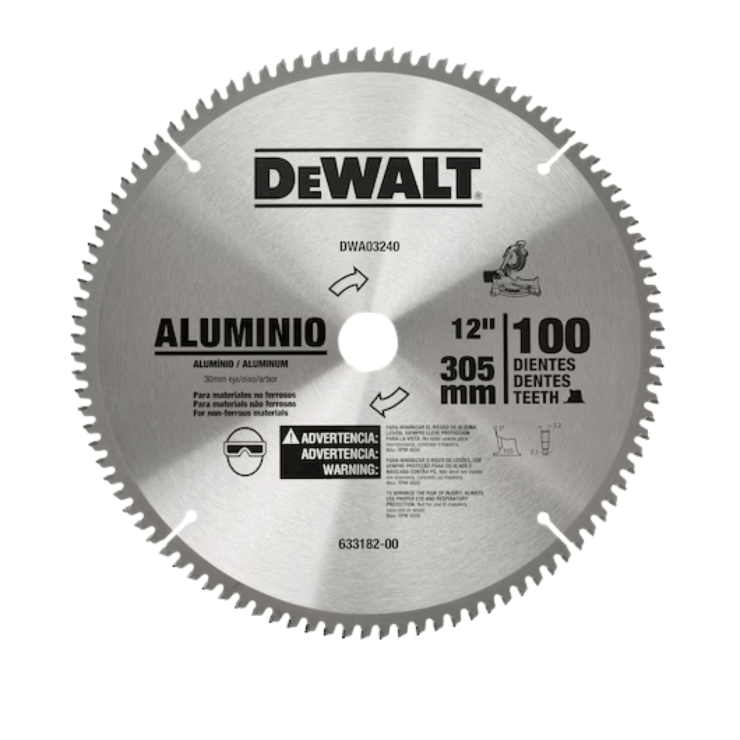 Marca Dewalt Código do Fabricante DWA03240 Diâmetro 12'' (305mm) Furo 30mm (com redutores de 1'' e 3/4'') Número de Dentes 100 Material Carbeto de tungstênio Aplicação Alumínio e materiais não ferrosos