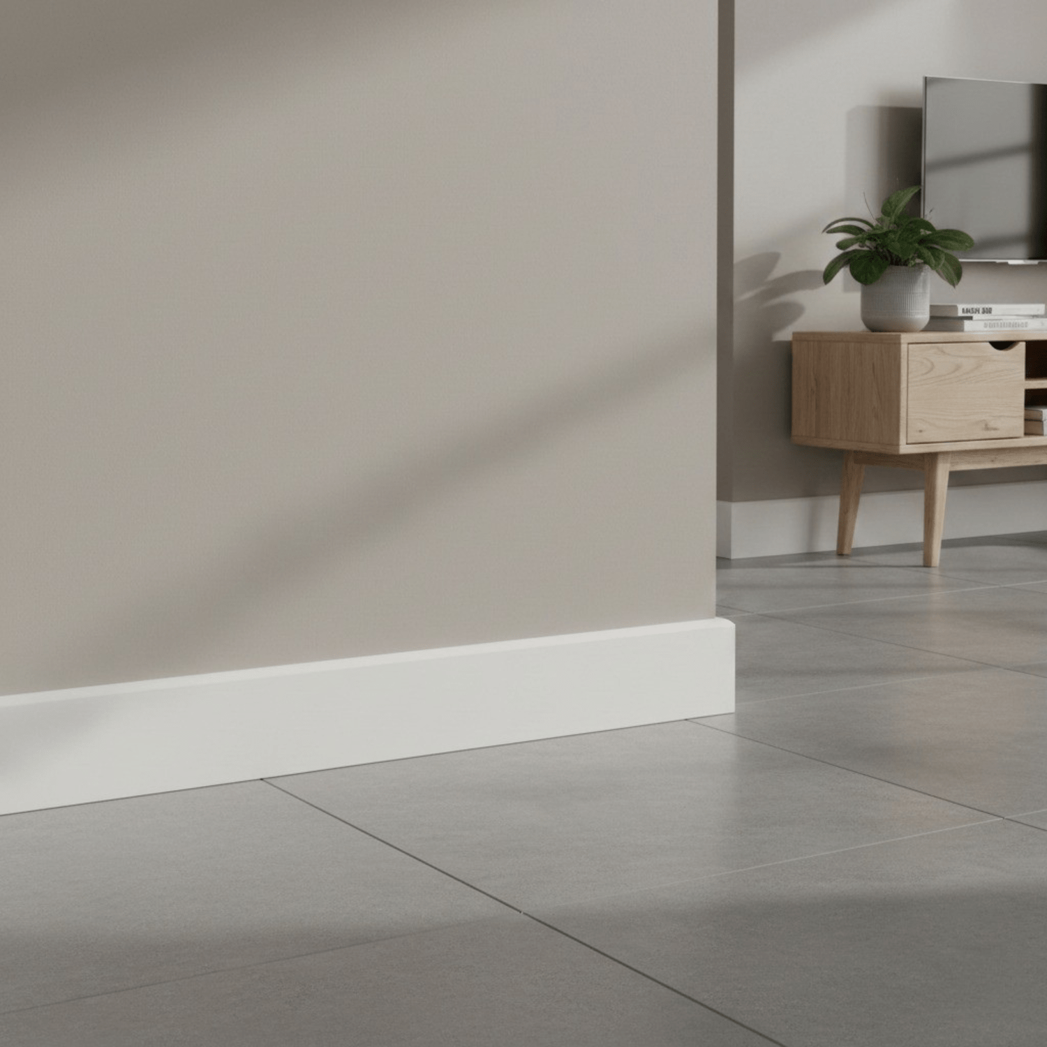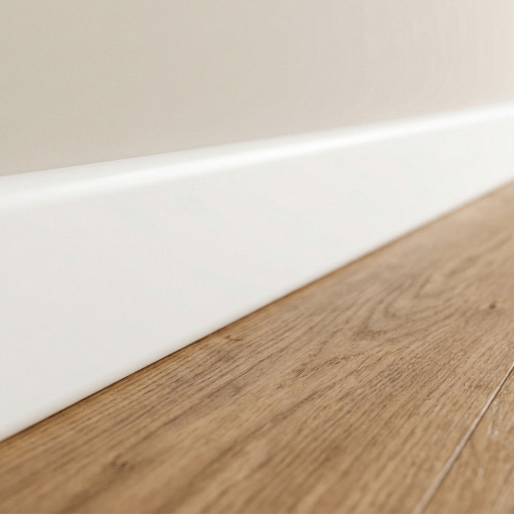 O rodapé liso da linha Build Up oferece um visual elegante com branco acetinado que não amarela com o tempo, graças ao aditivo anti-UV.